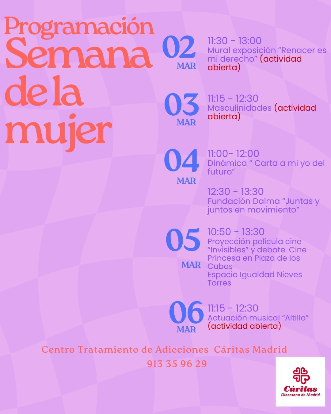 - En el salón de actos de Cáritas Madrid, a las 11:15 horas, actuación musical del grupo “Altillo”, como colaboración con el Centro de Tratamiento de Adicciones.