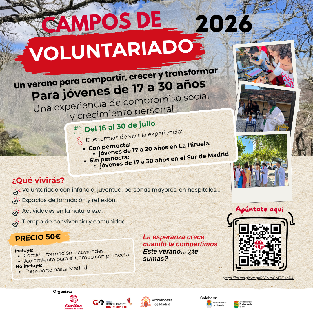 Pilar Algarate Pilar 6 de Abril de 2026Los Campos de Voluntariado 2026 de Cáritas Madrid invitan a jóvenes entre 17 y 30 años a vivir una experiencia de compromiso, convivencia y crecimiento personal.