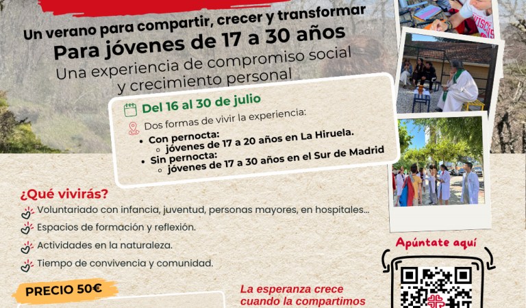Bajo el lema “la esperanza crece cuando la compartimos”, esta iniciativa invita a jóvenes a formar parte de una experiencia en la que compartir vida con otras personas, acercarse a distintas realidades sociales y participar activamente en la construcción de una sociedad más justa y solidaria. En esta edición, la propuesta se adapta a diferentes edades: la modalidad con pernocta está dirigida a jóvenes de entre 17 y 20 años, mientras que la modalidad sin pernocta se abre a jóvenes de entre 17 y 30 años.