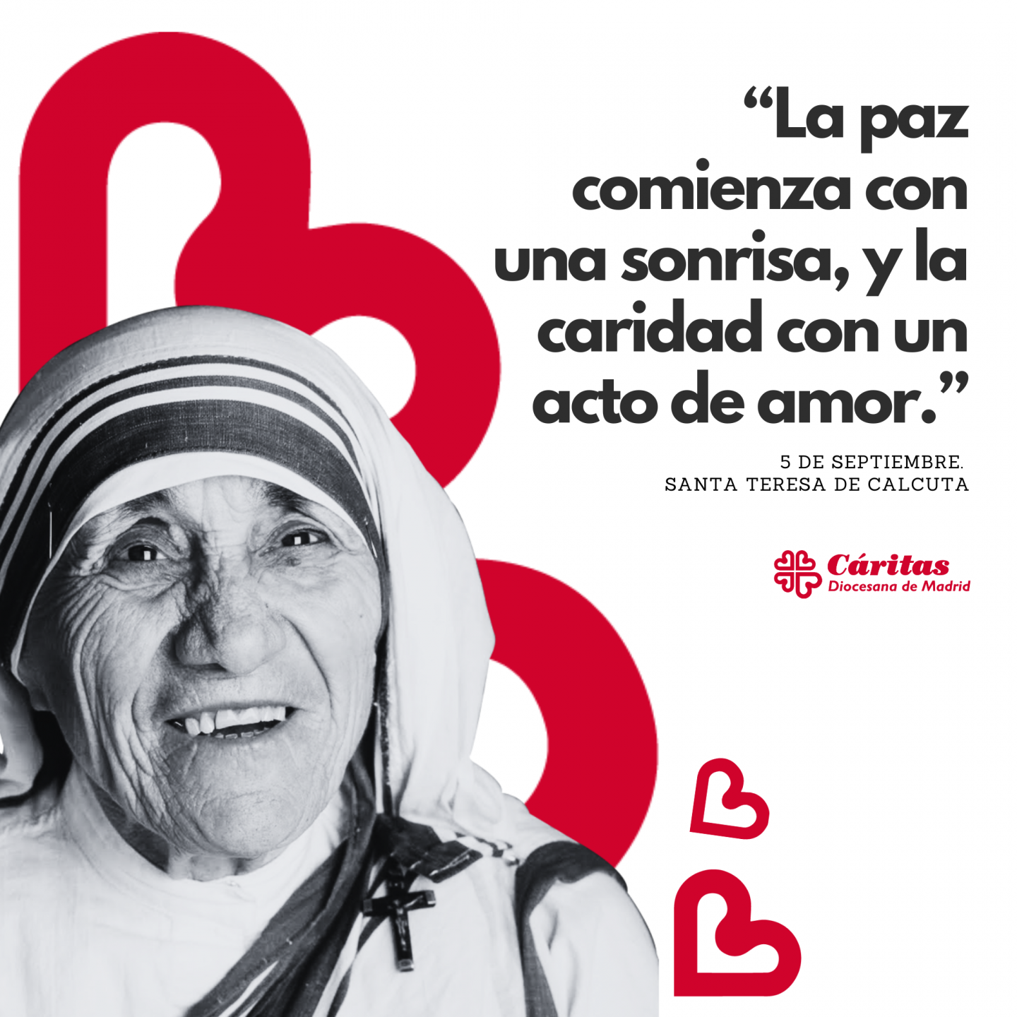 Este 5 de septiembre celebramos la festividad de Santa Teresa de Calcuta, una fecha reconocida por las Naciones Unidas como Día Internacional de la Caridad. En este día se conmemora el aniversario de la muerte de la Madre Teresa, premio Nobel de la Paz en 1979, cuyo legado continúa inspirando a millones de personas en todo el mundo.