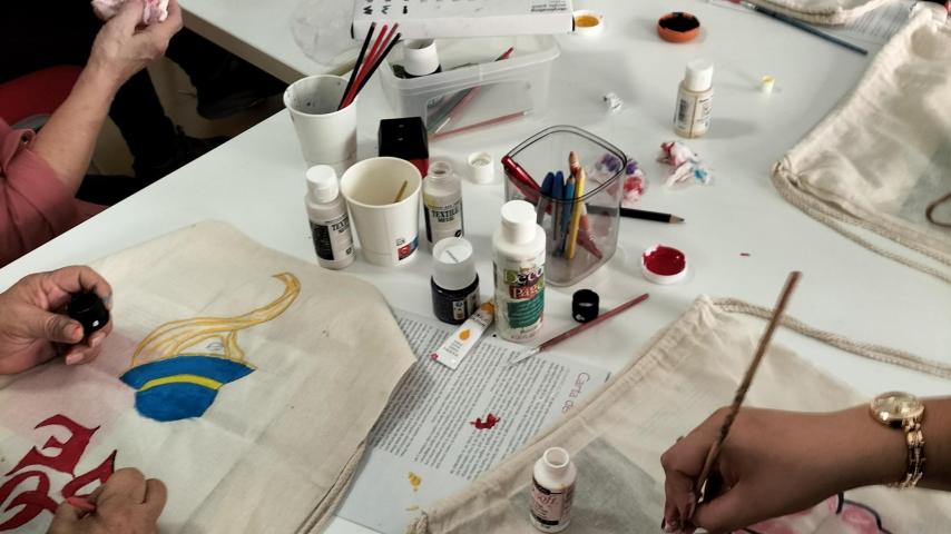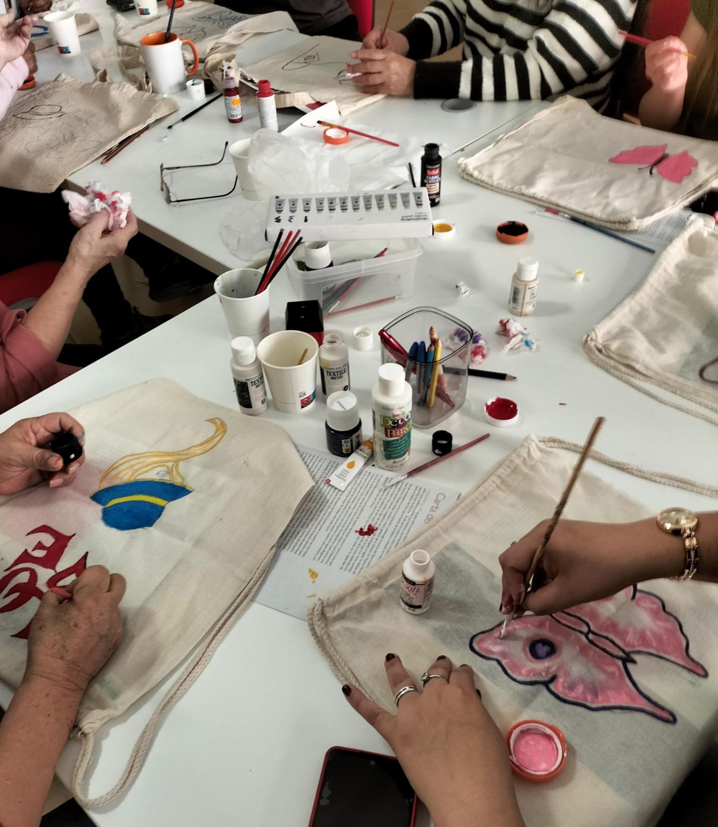- El taller de pintura textil “Con Rostros de Mujer”, en el que las participantes han plasmado de manera creativa, en bolsas de tela, emociones, rostros femeninos y deseos, fortaleciendo la cohesión grupal.