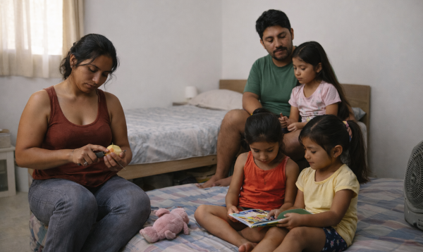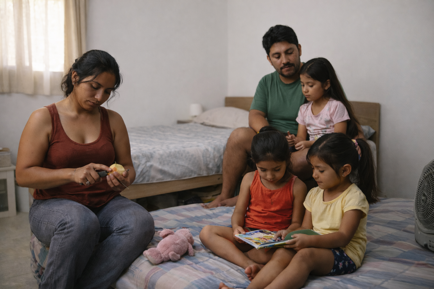 Matrimonio de Perú con tres hijas, vinieron por extorsiones. El esposo llegó hace tres años; era albañil y busca trabajo activamente, aunque no siempre lo contratan o le pagan. La esposa llegó después con las hijas; tenía una tienda de alimentación. Ahora viven los cinco en una sola habitación, ellos durmiendo en el suelo. Las niñas están escolarizadas. Necesitan 837 € para alquiler, transporte y clases extraescolares.