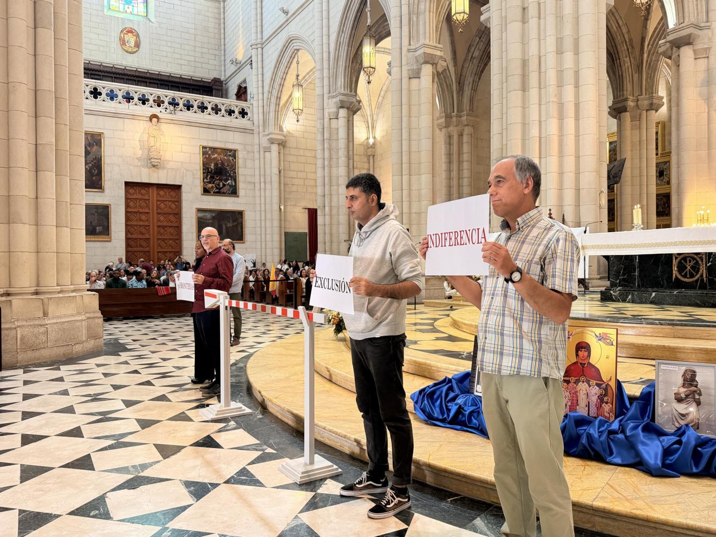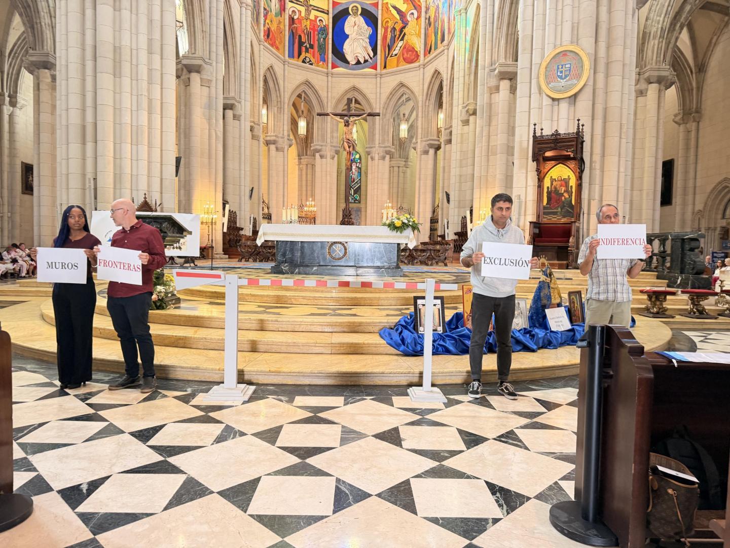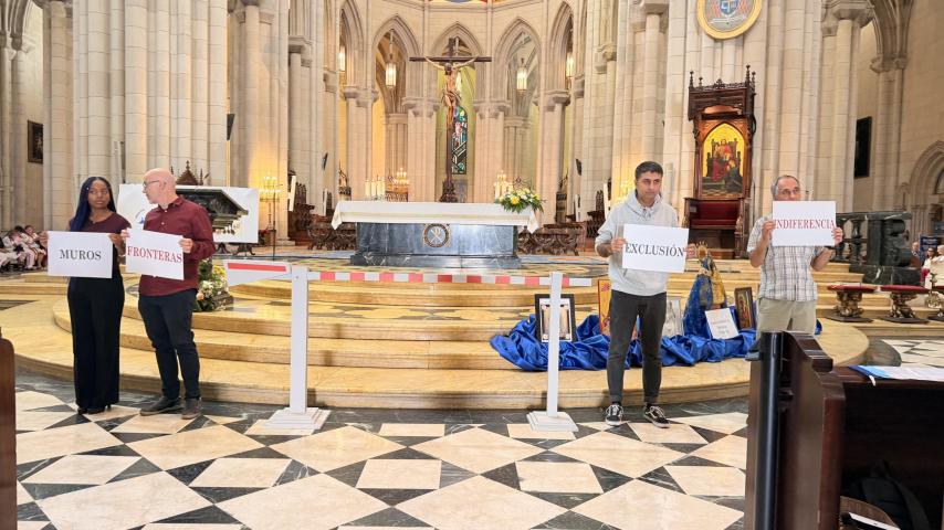 La Eucaristía comenzó con una representación que reflejó lo que viven muchas personas migrantes y refugiadas cuando llegan a nuevos países como España: muros, fronteras, exclusión e indiferencia. A partir de esa realidad, la celebración se transformó en un signo de fraternidad y de encuentro.