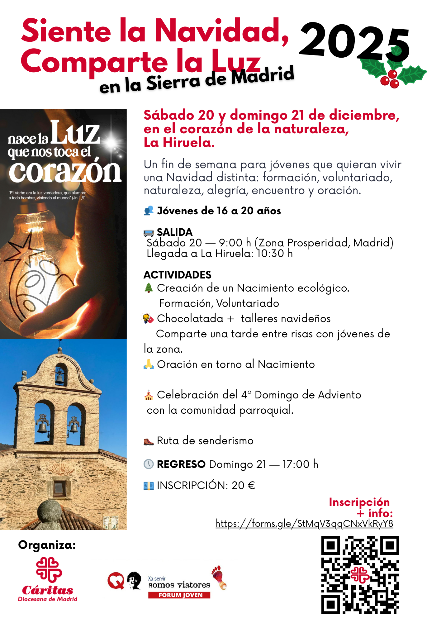 Pilar Algarate 3 de Diciembre de 2025Este año, la Navidad llegará antes a la Sierra Norte. Bajo el lema “Nace la Luz que nos toca el corazón”, las parroquias de La Hiruela y La Puebla, junto con Cáritas diocesana de Madrid y la Congregación de los Clérigos de San Viator, han preparado un fin de semana muy especial para jóvenes de entre 16 y 20 años. Será los días 20 y 21 de diciembre, en un entorno natural único donde la amistad, la formación, la creatividad y la espiritualidad se darán la mano.
