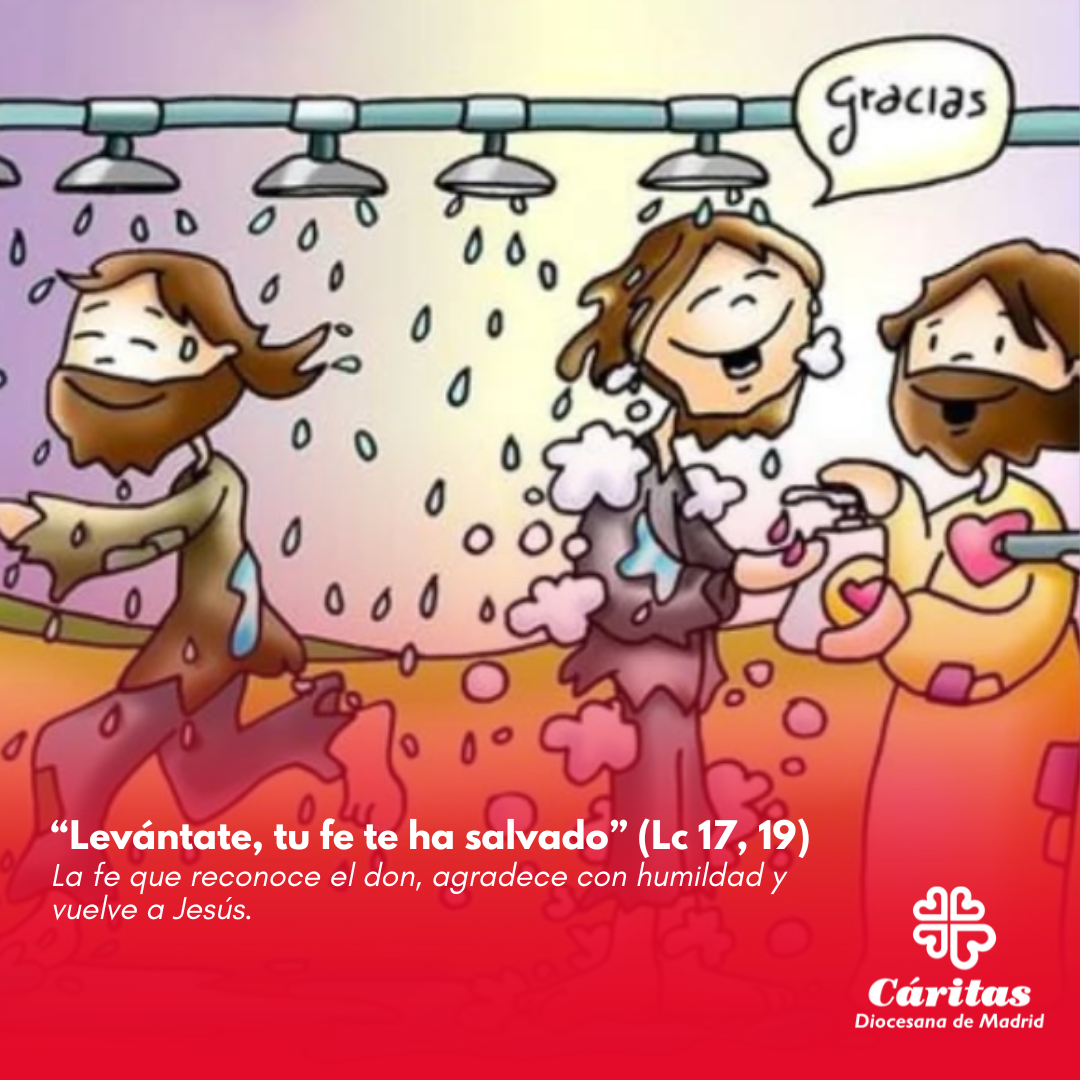 Una vez, yendo camino de Jerusalén, pasaba entre Samaría y Galilea. Cuando iba a entrar en una ciudad, vinieron a su encuentro diez hombres leprosos, que se pararon a lo lejos y a gritos le decían: «Jesús, maestro, ten compasión de nosotros». Al verlos, les dijo: «Id a presentaros a los sacerdotes». Y sucedió que, mientras iban de camino, quedaron limpios. Uno de ellos, viendo que estaba curado, se volvió alabando a Dios a grandes gritos y se postró a los pies de Jesús, rostro en tierra, dándole gracias. Este era un samaritano. Jesús, tomó la palabra y dijo: «¿No han quedado limpios los diez?; los otros nueve, ¿dónde están? ¿No ha habido quien volviera a dar gloria a Dios más que este extranjero?». Y le dijo: «Levántate, vete; tu fe te ha salvado».