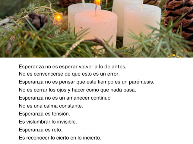Este domingo encendemos la primera vela de la Corona de Adviento, la vela morada, símbolo de la esperanza. Una esperanza que no nace de los discursos, sino de la vida compartida, del encuentro, de la comunidad que se sostiene unas a otras.